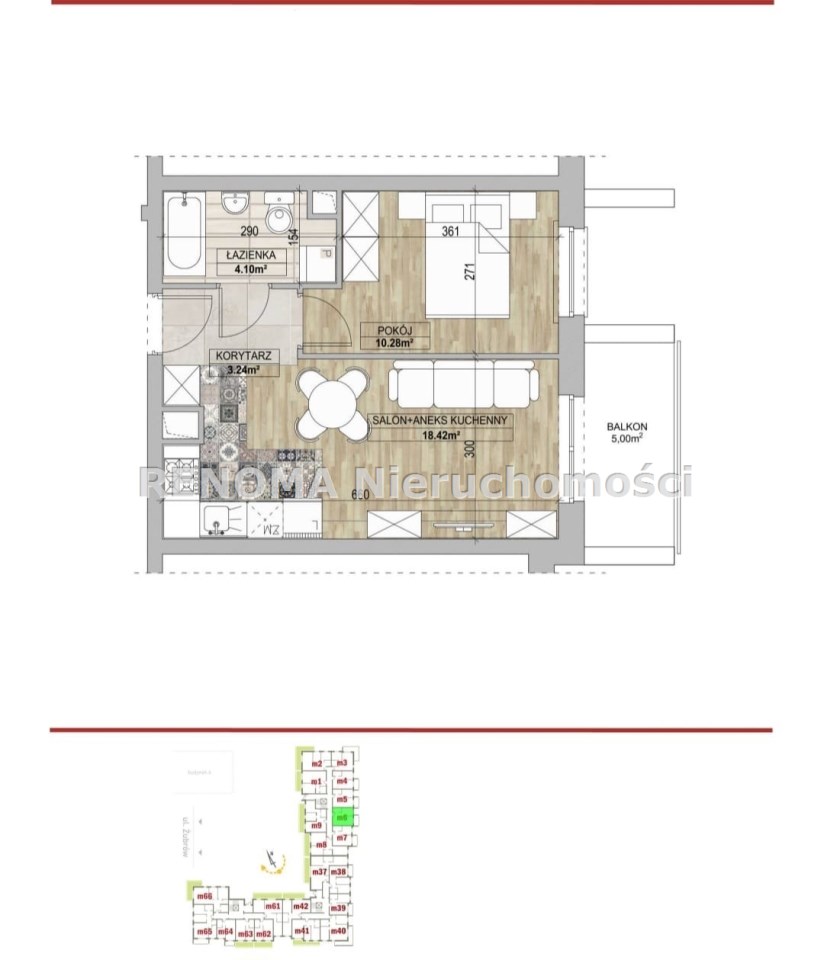 W skład mieszkania wchodzi salon z aneksem kuchennym (wyjście na balkon), sypialnia, przedpokój, oraz łazienka z WC