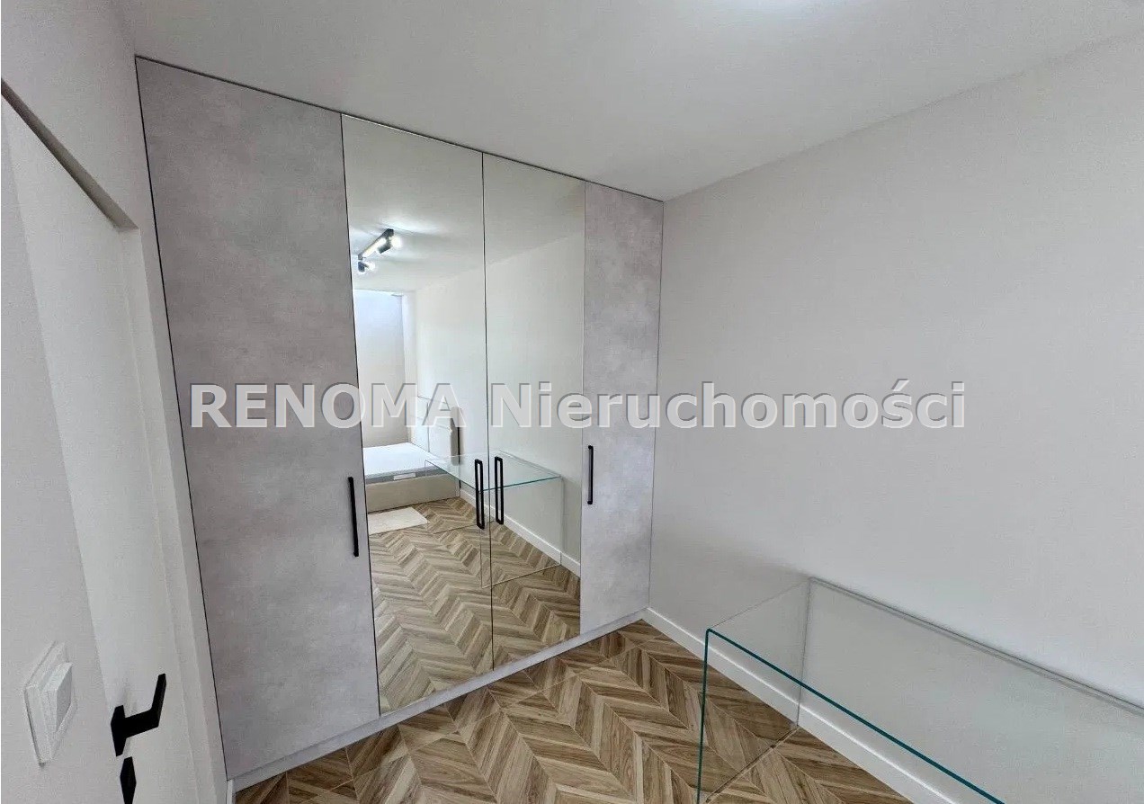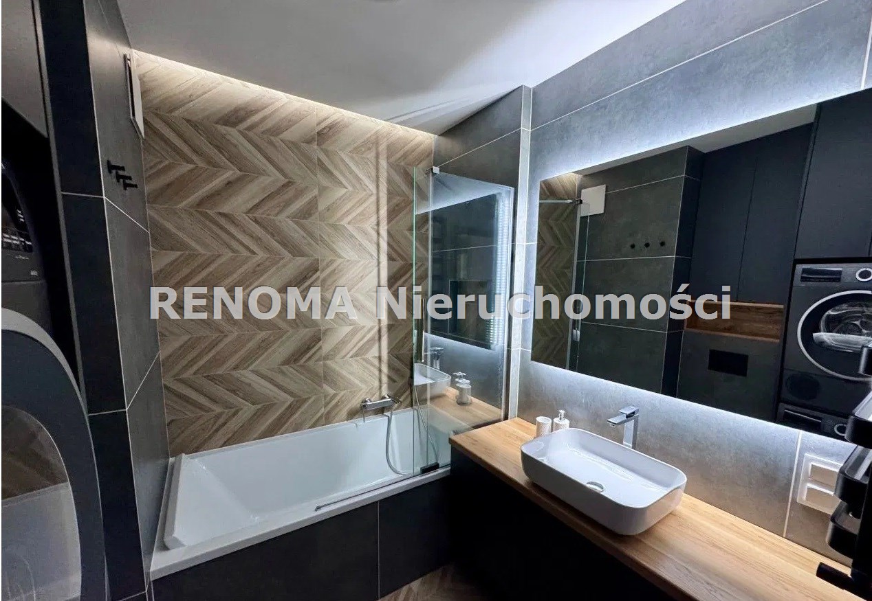 W pełni wyposażona kuchnia (lodówka, piekarnik elektryczny, płyta indukcyjna, zmywarka) oraz stylowe meble w salonie i sypialni zapewniają wygodę i nowoczesny charakter wnętrza.